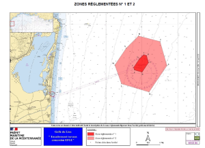 Une première zone réglementée délimitée par les segments joignant les points dont les coordonnées géodésiques, exclut la navigation en surface ou sous-marine, le mouillage des navires et engins et la plongée sous-marine. La baignade ainsi que l’utilisation de tous types d’engins de pêche sont interdits dans ce périmètre.