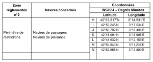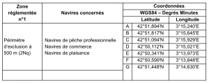Une première zone réglementée délimitée par les segments joignant les points dont les coordonnées géodésiques, exclut la navigation en surface ou sous-marine, le mouillage des navires et engins et la plongée sous-marine. La baignade ainsi que l’utilisation de tous types d’engins de pêche sont interdits dans ce périmètre.